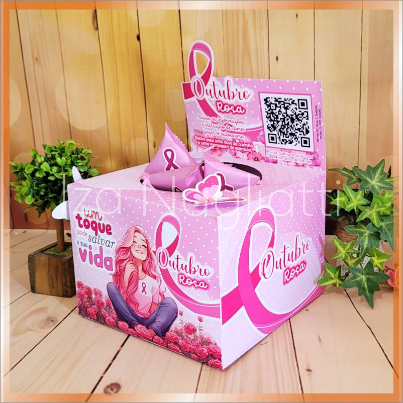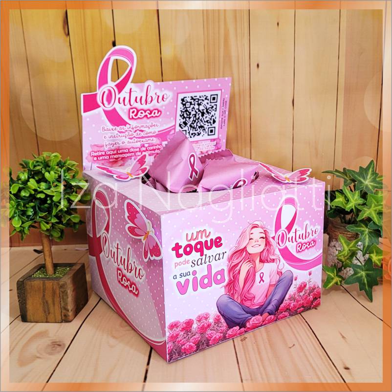 Dispenser grande 18 x 13 cm com pacotinhos e frases – outubro rosa